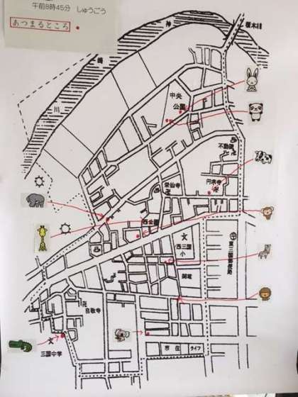 各町会の集合場所を玄関、各教室に掲示しています。町会ごとに、動物のマークをつけています。当日もそのマークのプラカードを持って教職員が立つ予定です。