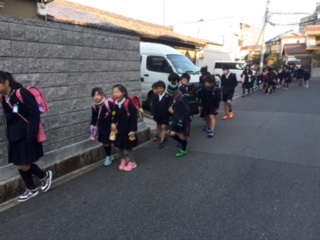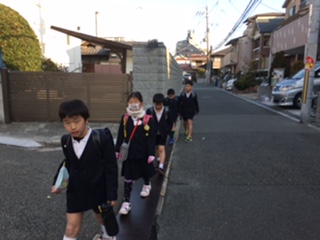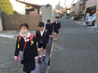 5年生や4年生が班長、副班長となって頑張っています。右側通行や、車が来た時など、「端に寄って!」と声をかけています。