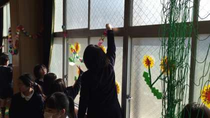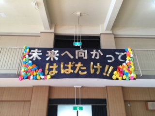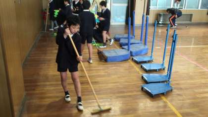明日の1時間目は、「卒業を祝う会」です。6時間目、5年生が講堂の掃除や飾り付けなどの準備をしました。ステキな会になるといいですね。