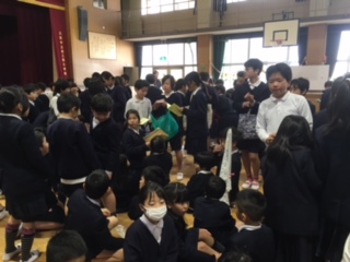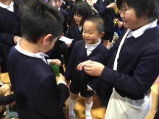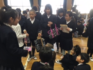 たてわり班の班長や副班長を務め、いろいろなことを教えてくれた6年生。班の下級生が、心を込めて作ったしおりやカードなどをプレゼントしました。5年生からは、会場の飾り付けがプレゼントです。