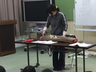 金曜日の6時間目、Y先生に日本の和楽器、箏について教えてもらいました。箏や、日本の和楽器についての説明の後「さくらさくら」「三段の調べ」などを披露してくれました。