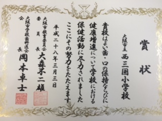 西三国小学校が、よい歯・口の健康、体力増進などについての取り組みを頑張ったという箏で、表彰されました。今朝の児童朝会で、子どもたちに知らせました。合わせて、中京大学の湯浅教授のお話から、健康には、運動・睡眠・食事が大きく関係していることなどを伝えました。また、保健だより等でお知らせします。