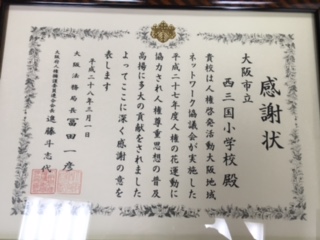 10月に淀川区の人権推進委員Tさんの応援を受けて、1年生がチューリップの球根を植え、育てています。暖かくなって、小さな蕾も見え始めています。今日は、大阪法務局から、その取り組みに対して、感謝状をいただきました。