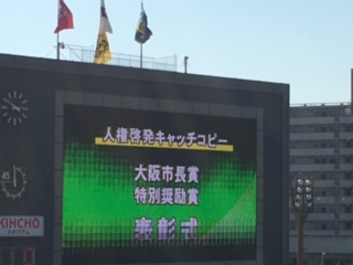 5年生が人権啓発キャッチコピーを考えて応募したところ、3人が、市長賞、特別奨励賞、優秀賞に選ばれました。12日、長居のスタジアムで表彰式が行われました。