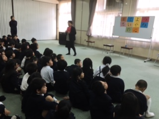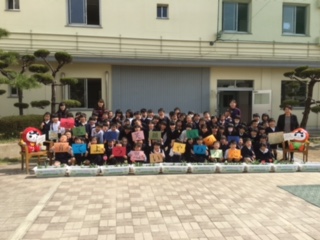 Tさんから「育てよう思いやりの心」のお話を聞いた後、みんなで育てているチューリップの鉢の前で写真を撮りました。チューリップのように大きく、美しくみんなの心の中にやさしい思いやりの花が咲くことを願っています。