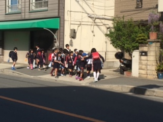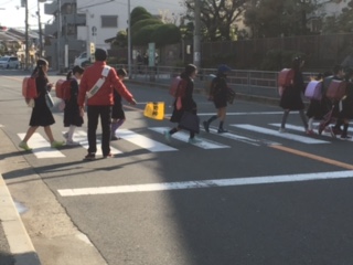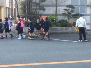 今日も少し肌寒い朝です。集団登校の班長さんは、横断歩道の手前や曲がり角などで後ろを振り返って安全確認をしています。さすがです!春の交通安全週間中は、町会ごとに見守りをしてくださっています。ありがとうございます。