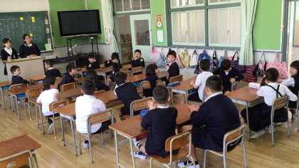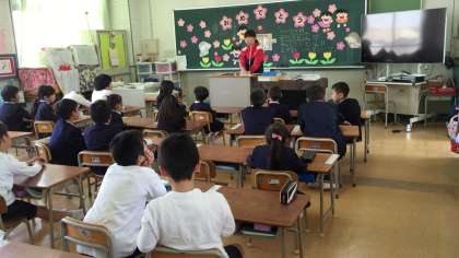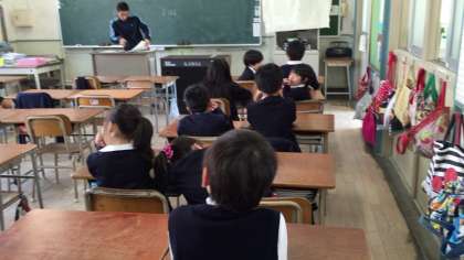 登校班ごとに教室に集まり、地区児童会を開きました。集団登校の安全指導や下校後の遊びについて、担当の先生から話を聞きました。
