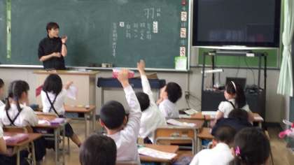 新しい漢字「羽」を習いました。「羽」を使った文を考えて発表しました。「とりの羽がぬけます」「くろい羽のとりがとびます」などが出ました。