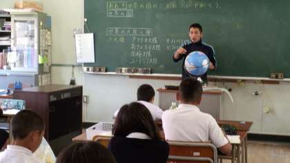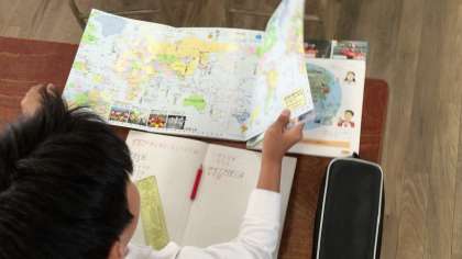 世界地図を出して、大陸の勉強をしました。南極大陸は、地図では下の方に少ししか見えません。地球儀で見るとよく分かりますね。