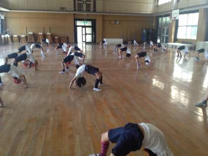 その後、担任による基本のストレッチ運動なども行っています。ほとんどの子ども達が、ブリッジもさっとできています。体を柔軟にする運動は、これからも工夫して取り入れていく予定です。