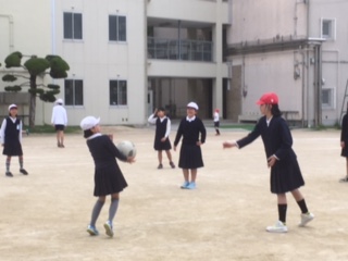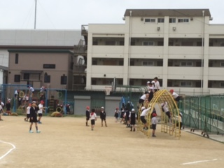 児童集会前のひと時、たくさんの子が運動場で遊んでいます。