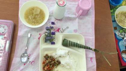 今日の給食では、「ちらしずし」「ちまき」が出ました。おいしくいただきました。給食室前の掲示板も、こどもの日の飾り付けです。