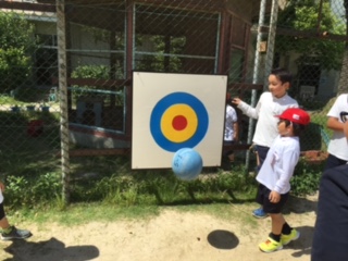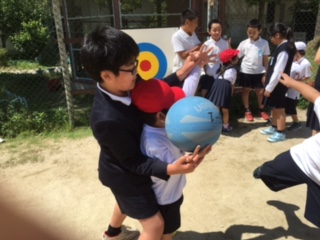 一年生がボールを投げていました。高学年が側で見ていて、投げ方のアドバイス!いいですね^_^