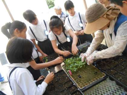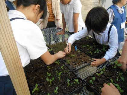4月に蒔いたマリーゴールドやダリアの芽が大きく育ちました。花苗ボランティアさんと一緒に飼育栽培委員会児童がポットに苗の植え替えをしました。種から育てるのは、今年で3年目。発芽率も年々上がってきて、十三公園事務所の指導員さんから褒めていただきました。