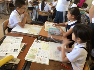 「ごみを減らす工夫」について調べ、まとめました。グラフを見て人口とごみの関係について気づいたことを話し合い、なぜ人口は増えているのにごみが減ってきているのか考えました。リサイクルやごみの分別など自分の生活の中からも考えています。