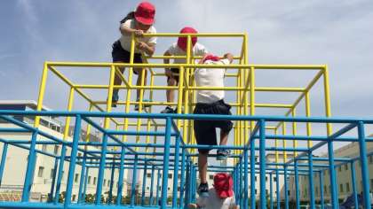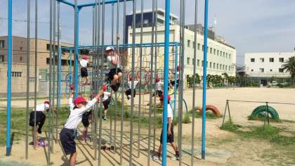 鉄棒で逆上がりの練習をしました。その後、ジャングルジムや登り棒、肋木などの遊具を登りました。ジャングルジムと登り棒は、昨年度に設置したものです。授業や休み時間の遊びを通して腕や脚を鍛えます。