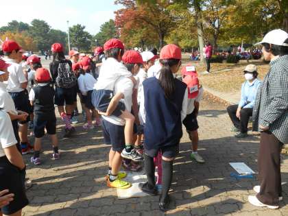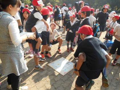 新聞紙を1枚広げ、たてわり班の7〜8人が全員乗ります。6年生が1年生をおんぶするなど、工夫して乗らないと乗れません。