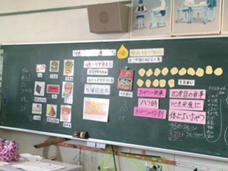 新高小学校の栄養教諭の先生に来ていただき、おやつについて考えました。育ち盛りの子ども達にとっておやつは大事な栄養源となりますが、とり方を間違うと生活習慣病につながっていくという話を分かりやすく教えてくださいました。果物やあまり糖分がたくさん入っていないもの、油分の多くないものなど、自分で何をどの位食べるとよいか、上手に選ぶ事ができるといいですね。ちなみにポテトチップスなら一回に15枚までが、よいそうです。