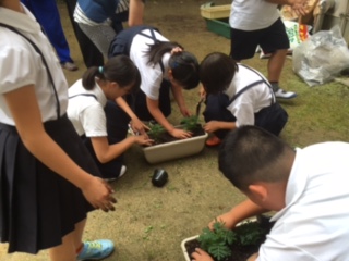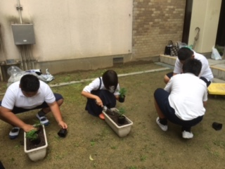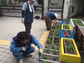 種から大きく育ったマリーゴールド、ダリア、ニチニチソウなどをプランターに植え替えました。今年は発芽率が高く、90%芽が出たのでたくさんの苗ができました。何回かに分けて植え替えているので、もうすっかり慣れてとても上手です。お世話になっている地域の方にも喜んでいただこうと、西三国センターに届けました。花いっぱいの西三国になあれ!
