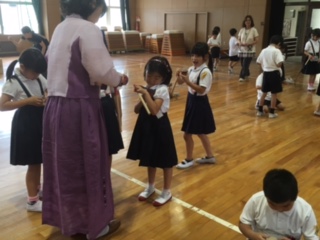 金曜日、民族クラブで教えてくださっているソンセンニムをゲストティーチャーに迎え、韓国・朝鮮のあいさつや遊びを学びました。初めて目にするものが多かったのですが、みんなで楽しく遊びました。給食の時間などにもまた入ってくださりもっといろいろなことを教えていただく予定です。