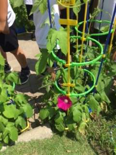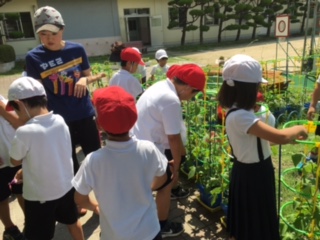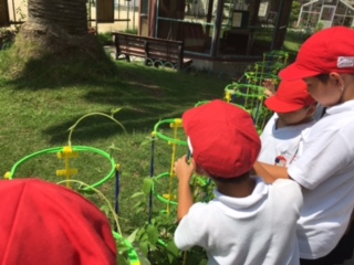 「花がさいたよ!」とうれしそうに報告に来た1年生。つぼみもたくさんできています。ツルが長く伸びてきているので、先を少しつまんで切り取りました。こうすることで、わきからまたたくさんつぼみが出てきます。ぐんぐん育っている朝顔のように、子どもたちも大きくなあれ!