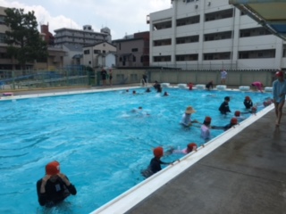 いきものがかりの「ジョイフル」の音楽に合わせて3分間、自分の目標に向かってどんどん泳いでいます。後半は、平泳ぎの練習をコース別に行いました。