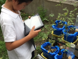 5月に植えたミニトマトの花が咲き、青い実が出来てきました。タブレットを、持って観察です。肥料も少しずつ与えました。美味しい実がたくさんできるのを楽しみにしている2年生です!