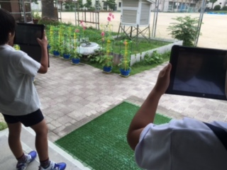 夏の花壇の様子を観察していました。1年生のアサガオのほか、タチアオイの花や、イチジクの実にも気づきました。
