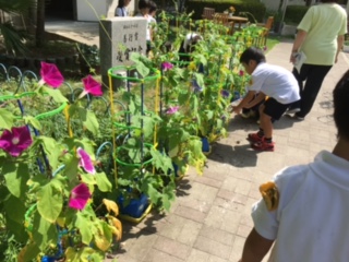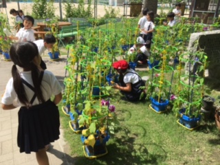 「見て、見て!いっぱいさいたよ!」とうれしそうに知らせてくれる1年生。一つの植木鉢から違う色の花が咲いているのもあり、(なんで??)と不思議そう。この暑さで葉っぱが枯れているのもあり、ていねいに取っていました。