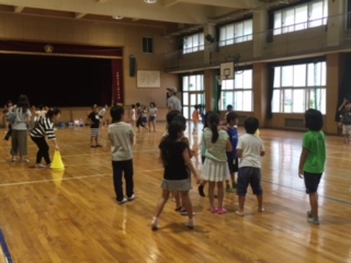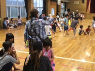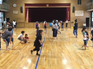 下の学年の子どもたちは、分かれて体育館でドッヂビーなどをしてカレーが出来上がるのを待ちます。