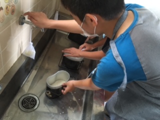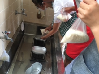 飯盒でご飯を炊くのでお米をといでいます。