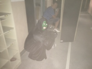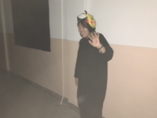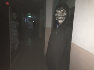 廊下の窓に暗幕を張り、ついたてを作ってたくさんのボランティアさんたちがお化け役で大活躍! Y先生も4年連続です!