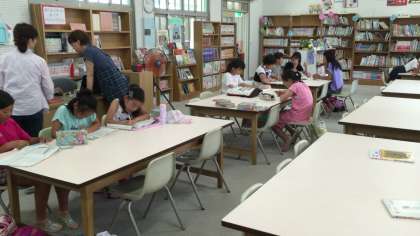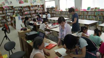 今日から夏休み、ボランティアの方にもお手伝いしていただきながら図書館を開放しています。本を読んだり読んでもらったり、宿題したりしていました。