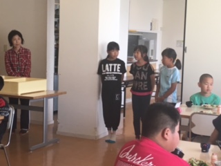 朝食です。ご飯、ワカメの味噌汁、焼き魚、サラダ、ウインナー、ふりかけなどをおいしくいただきました。しっかり食べて活動します!
