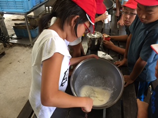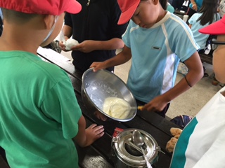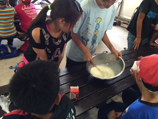 カレーを食べて焼き板を作りました。その後は、楽しみにしていたアイスクリーム作りです。説明をよく聞かないとうまくいかないよといわれていたので、みんなしっかり聞いてスタート。ツノがたつくらいまで泡立て器で生クリームを泡立てそこに砂糖を入れ、さらに牛乳を入れてさくっと混ぜました。