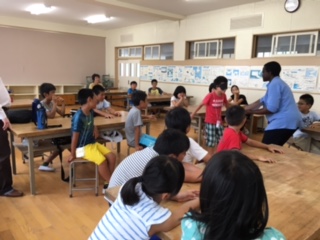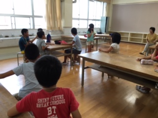 高学年は、1時から3時まででした。目隠しをして、go、right、left、stopなどでみんなが出す指示に従って動くゲームをしていました。和気あいあいとした雰囲気で、暑さを物ともせず楽しんでいました!