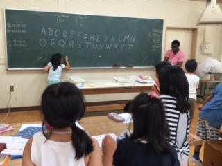 簡単な単語のスペルを暗記して、一文字ずつ黒板に書いて完成させます。ゲーム形式で楽しく学んでいます。