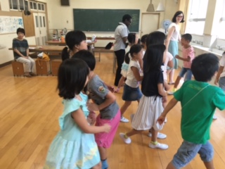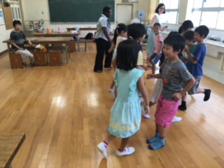 数字の歌を歌いながら、速く、ゆっくりなど体を動かしながら英語を覚えています。