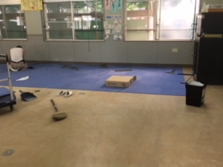 1年1組の床が、リノリウムで剥がれかけていたので、フローリングにしました。音楽室のカーペットも新しく張り替え中。半分まで出来上がりました。2学期から気持ちよく学習できます。