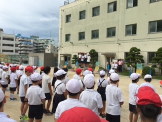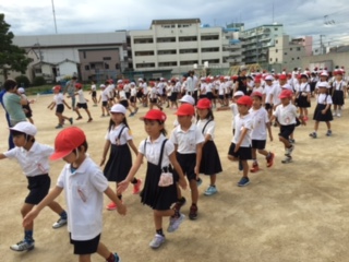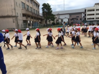 教室に入る時は、行進の練習をしながら歩きました。腕を上げて太もももしっかり上げて上手でした!