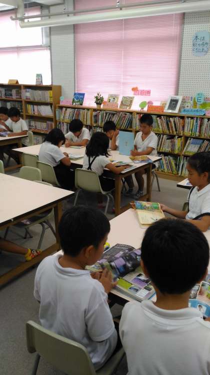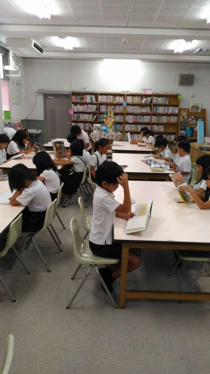 2学期最初の図書の時間です。それぞれ興味のある事について調べたり、教えあったりしていました。