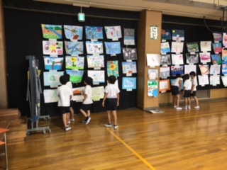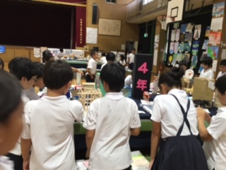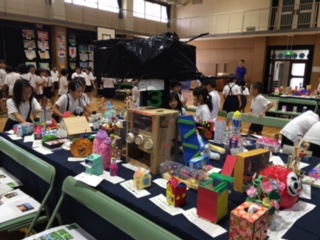 友達や違う学年の作品を見て回りました。「すごかった!!」と1年生。来年の夏休みに作ってみたいなと思ったそうです。工夫しているところ、素敵だなと思うところをたくさん見つけました。