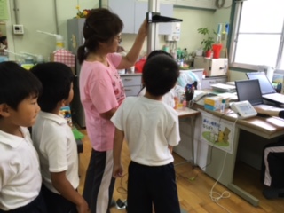 身長と体重を測っています。夏休みの間にみんなずいぶん成長しました!