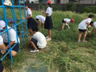 金曜日の5.6時間目、5.6年生が運動場周りの雑草を抜いてくれました。ジャングルジムの下にも潜り込んで、きれいにとってくれました。ありがとう!