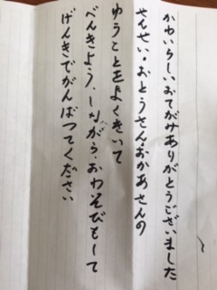 敬老の日に子どもたちは、手紙を贈りました。お礼のお返事をわざわざ届けてくださり、とてもうれしくなりました。ありがとうございます。いつまでもお元気でいてください。
