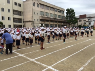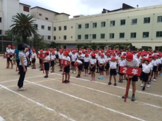 2時間目に全校で開会式、閉会式、歌の練習などを行いました。