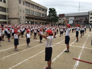 「運動会の歌」が今年から変わりました。教室でよく練習しているので、とても大きな声が出ています。ラジオ体操は、ピシッとするところなど力の入れ方のメリハリに気をつけてこれからも練習をしていきます。