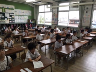 プリントを見ないで歌う練習をしています。意味はまだまだ難しいけれど、一生懸命、元気に歌う1年生です。