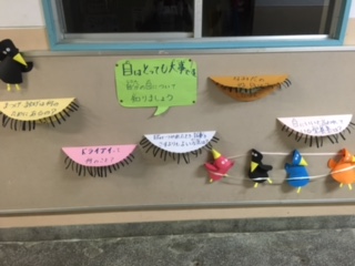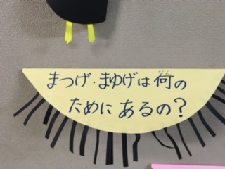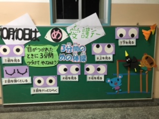 保健室前に「目の愛護デー」について掲示してあります。ドライアイってなんのこと?など質問も掲示しています。まぶたをめくると答えが書いてありますよ。