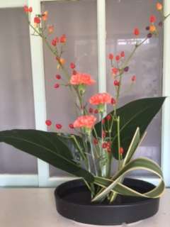 第2土曜日は、生涯学習ルームの生け花、お茶の教室があります。レインボーツリートウガラシ、ニューサイラン、ベルエトン、カーネーションを生けてくださいました。